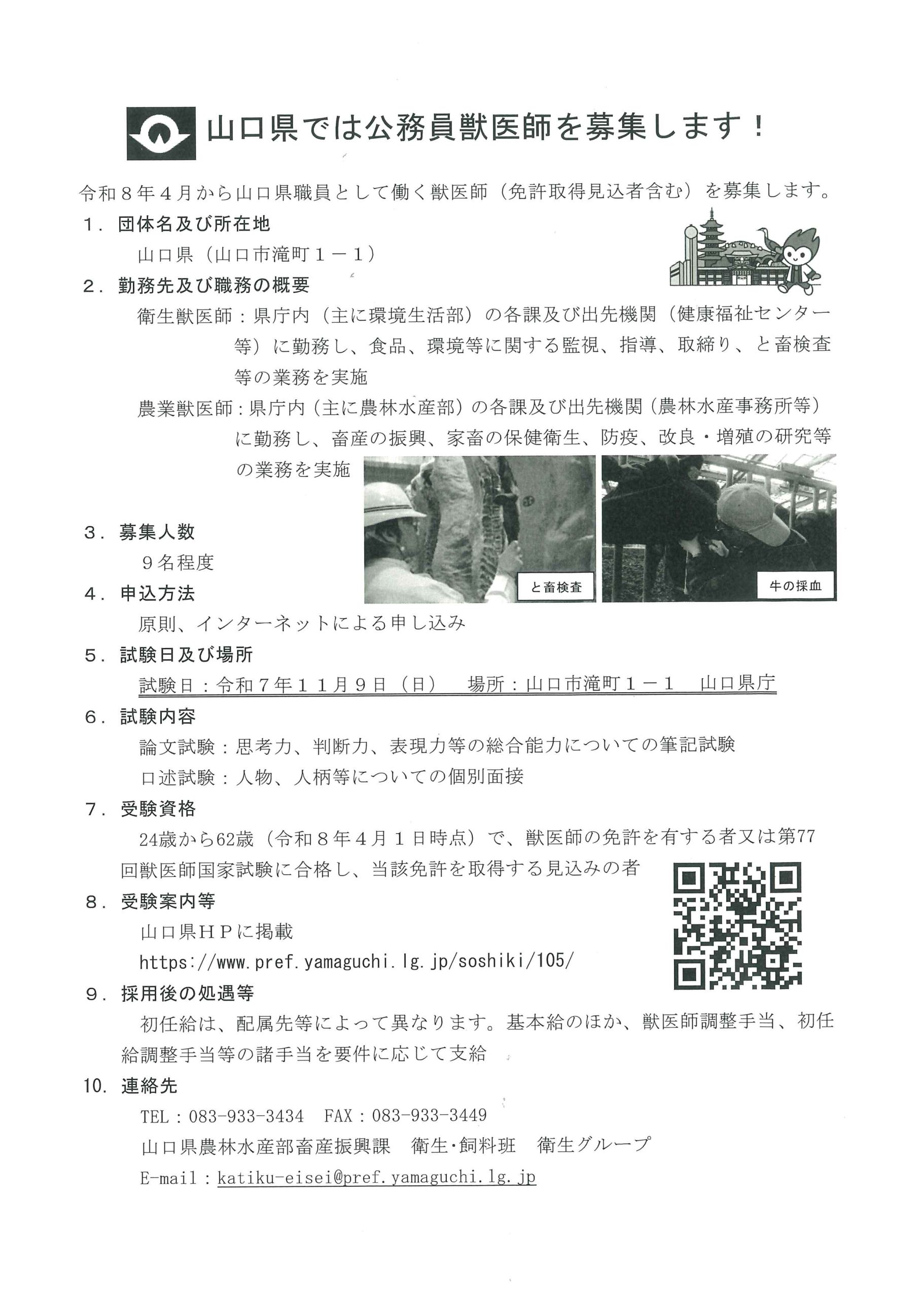 *令和7年度山口県職員採用選考試験(獣医師)(2次募集)受験案内(令和8年度採用予定)詳細